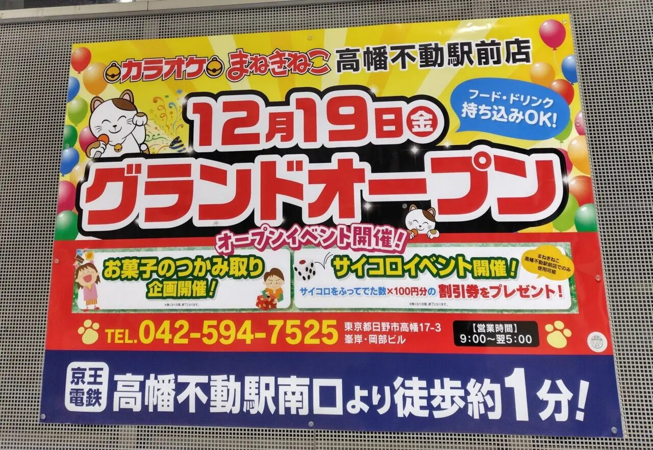 読者の方から寄せられた情報によると、「カラオケまねきねこ高幡不動駅前店」が2025年12月19日(金)にオープンすることがわかりました!